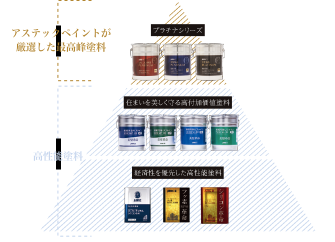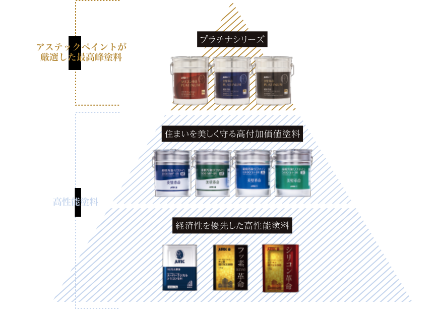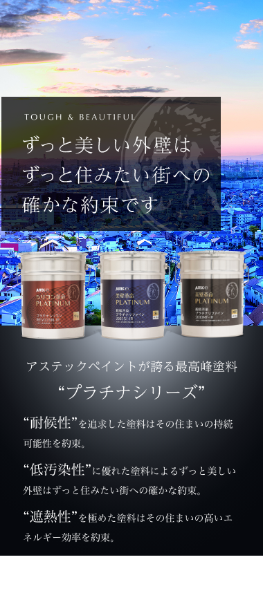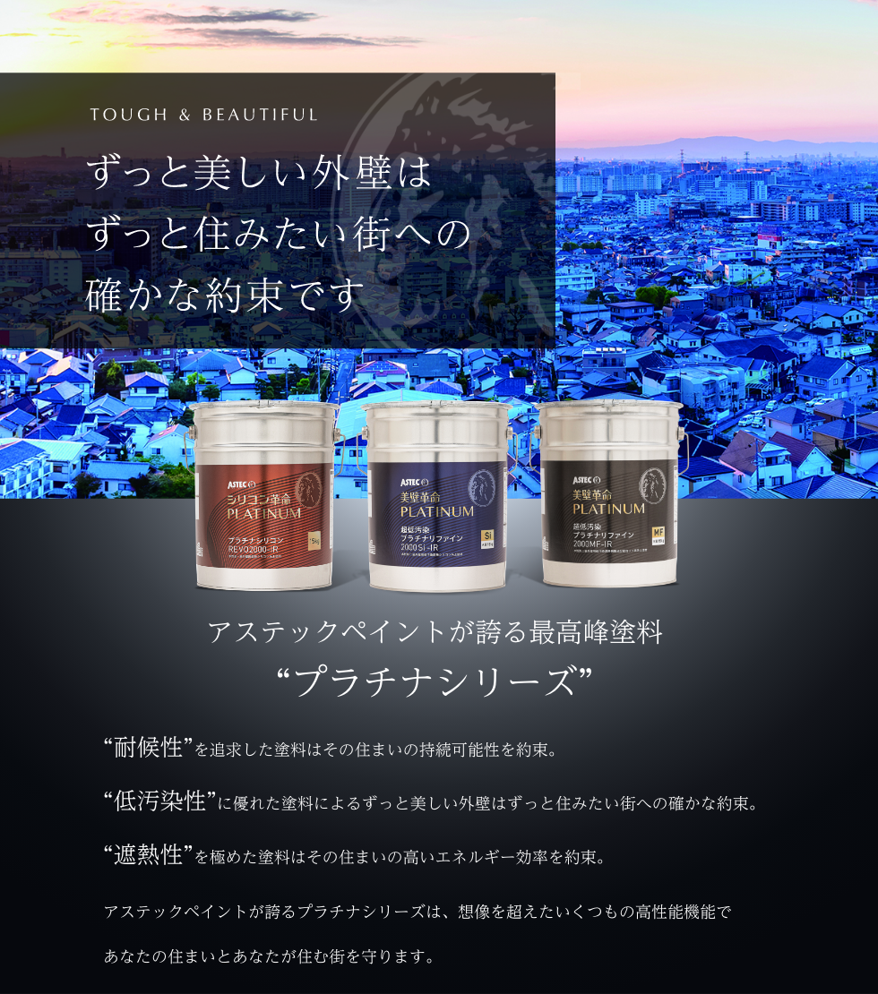 超高性能塗料”プラチナシリーズ”は、アステックペイントの塗料の中でも住まいを永く守り続けるために厳選された最高峰塗料ラインナップ。