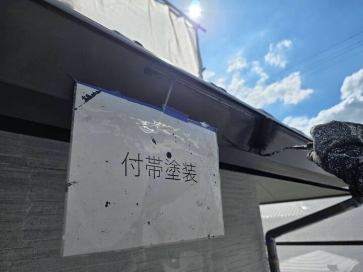 外壁の上塗りの様子です。仕上げ塗りで膜厚をつけて防水性を高めて色のムラが出ないように仕上げています。下塗り同様メーカーが定める希釈率・缶数管理は厳守で行っております。付帯塗装 (樋)