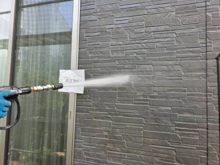 高圧洗浄でしっかりチョーキング、コケ、汚れを落としていきます。