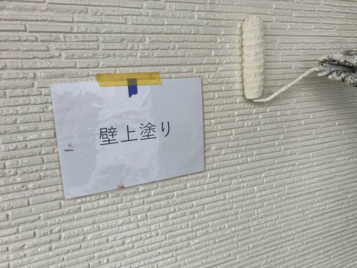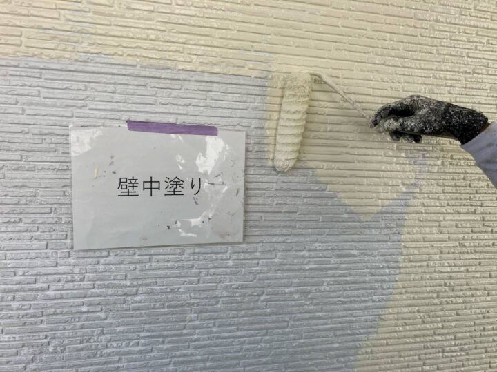 外壁の中塗りの様子です。指定の色で一通り塗装していきます。外壁 上塗り
