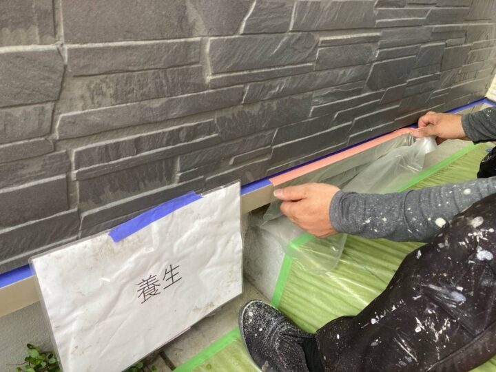 塗らない部分、塗料の飛散してはいけない部分はビニール等で養生しておきます。またテープ養生をしっかり行う事で養生を外した際綺麗なラインが出て仕上がりがきれいになります。