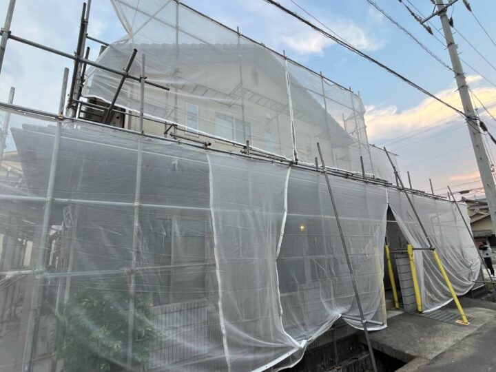 周り4面に足場を組み立てています。安全性を重視して塗装の職人さんが作業をしやすい足場を組み立てます。