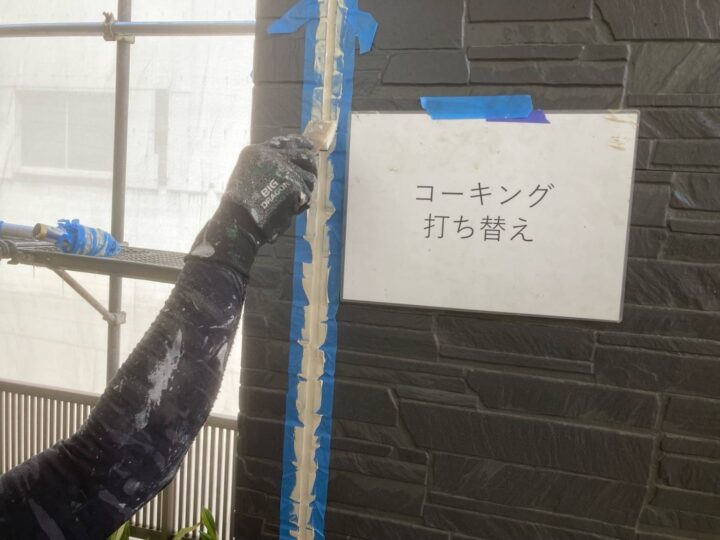コーキングを撤去して新しいコーキングを打設しています。コーキングは塗料の耐候年数に合わせたコーキングを使用致しております。