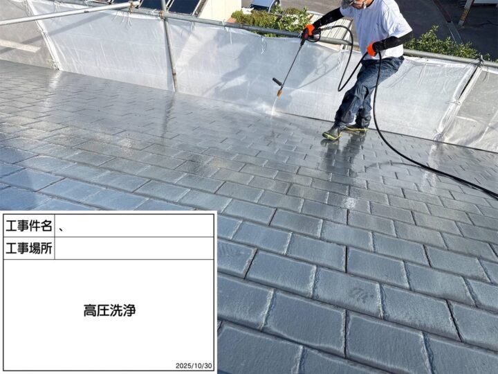 まずは高圧洗浄でしっかり汚れを落とし、下地処理を丁寧に行うところからスタートしています。塗装や防水は“下地づくり”が一番大事な工程になりますので、時間をかけて状態を整えています。