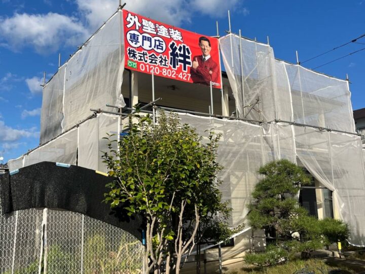 足場を組み立てています。足場を組む際はご近所にあいさつ回りを事前に行っております。