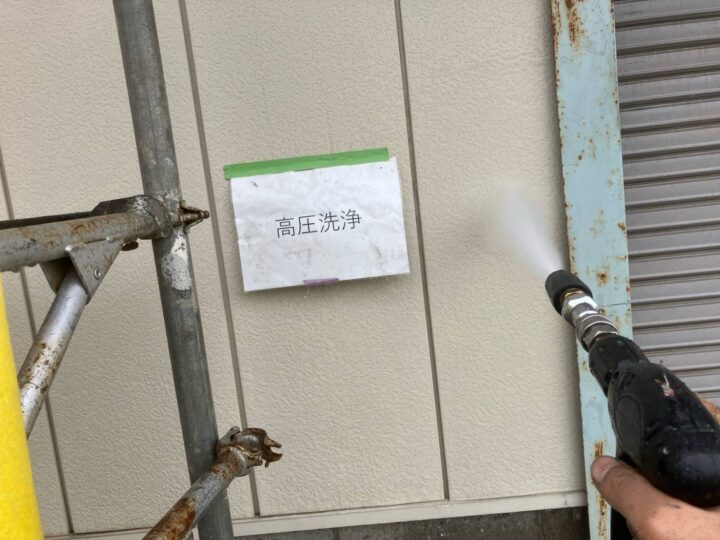 高圧洗浄でしっかりチョーキング、コケ、汚れを落としていきます。