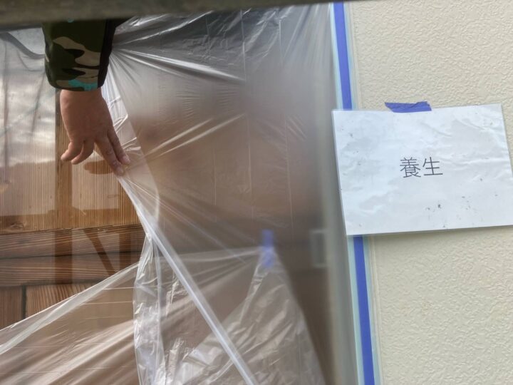 塗らない部分、塗料の飛散してはいけない部分はビニール等で養生しておきます。またテープ養生をしっかり行う事で養生を外した際綺麗なラインが出て仕上がりがきれいになります。