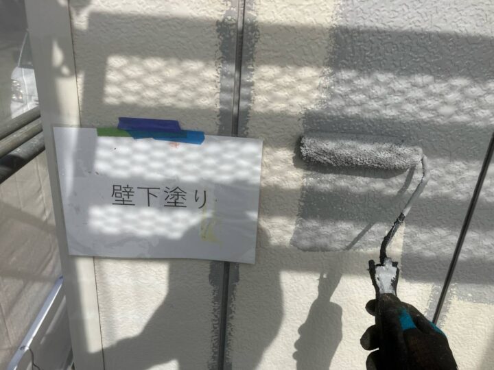 外壁の下塗りの様子です。メーカーが定めた建材・上塗り材に合わせた下塗り材をしっかり塗布しております。希釈率・缶数管理は徹底して行っております。