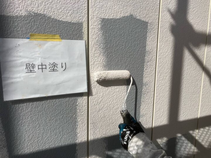 中塗りを施工しています。しっかり膜厚をつけて塗り込んでいきます。中塗り完了しますと全体の雰囲気が分かる様になります。