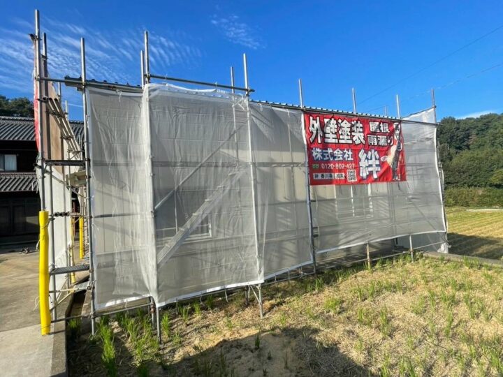 周り4面に足場を組み立てています。安全性を重視して塗装の職人さんが作業をしやすい足場を組み立てます。