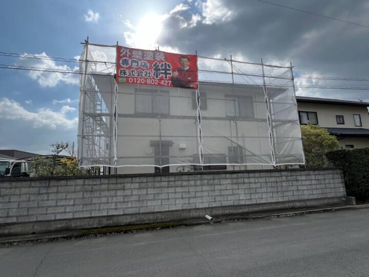 足場を組み立てています。足場を組む際はご近所にあいさつ回りを事前に行っております。