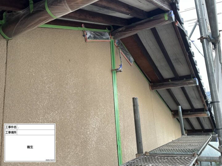 塗らない部分、塗料の飛散してはいけない部分はビニール等で養生しておきます。またテープ養生をしっかり行う事で養生を外した際綺麗なラインが出て仕上がりがきれいになります。
