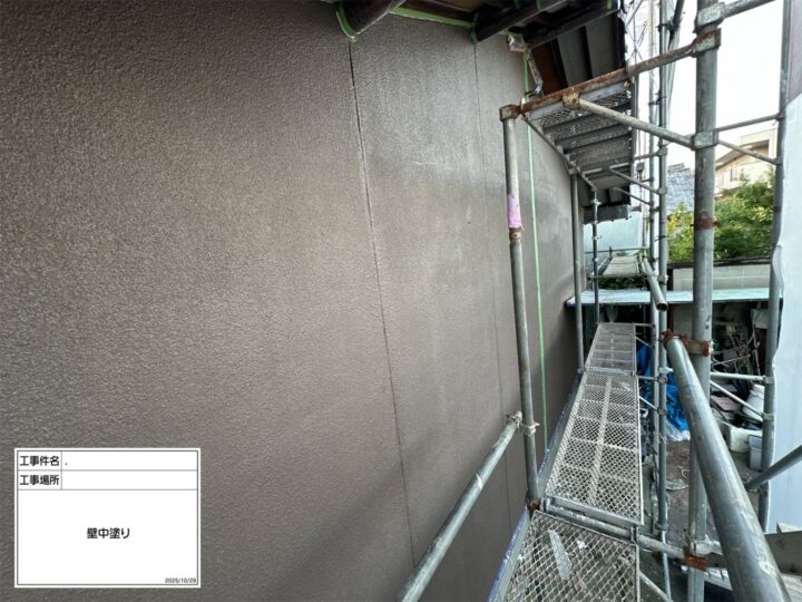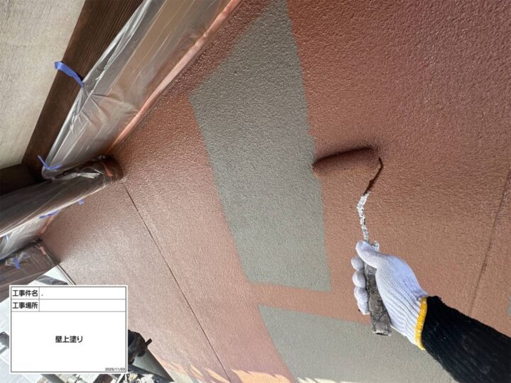 中塗りを施工しています。しっかり膜厚をつけて塗り込んでいきます。中塗り完了しますと全体の雰囲気が分かる様になります。