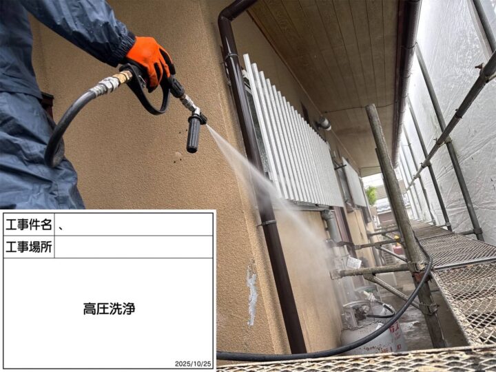 高圧洗浄でしっかりチョーキング、コケ、汚れを落としていきます。
