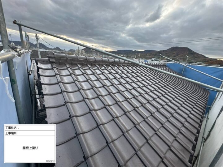 屋根の上塗りの様子です。仕上げ塗りで膜厚をつけて防水性を高めて色のムラが出ないように仕上げています。下塗り同様メーカーが定める希釈率・缶数管理は厳守で行っております。