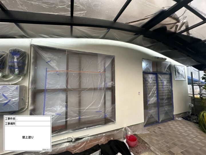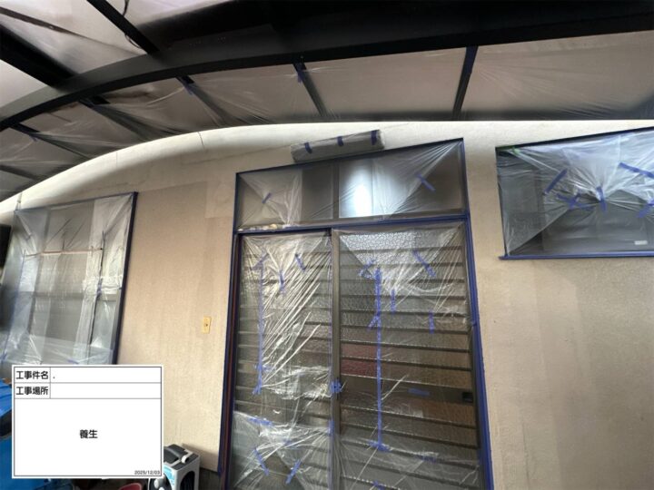 サッシや土間等、塗装しない部分や飛散の可能性のある場所はしっかりビニール養生を行っております。