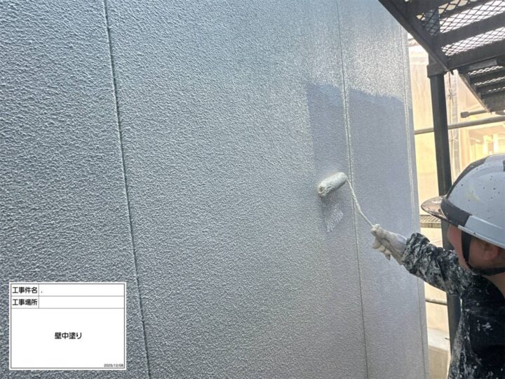 外壁の中塗りの様子です。指定の色で一通り塗装していきます。
