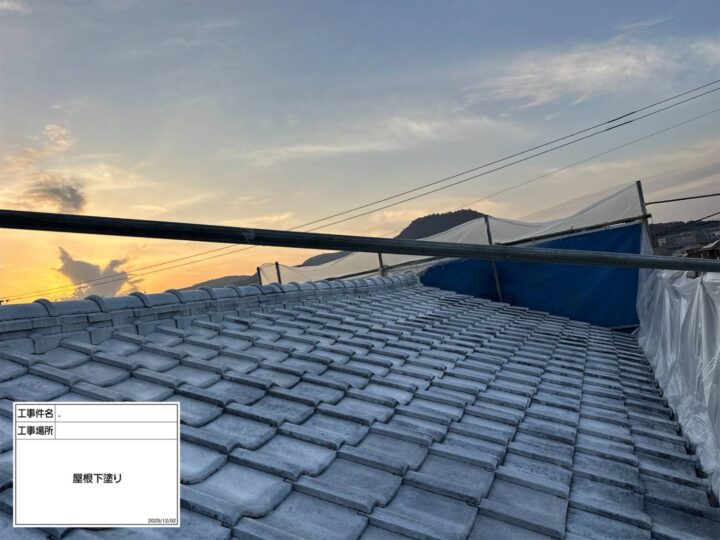 屋根の下塗りの様子です。メーカーが定めた建材・上塗り材に合わせた下塗り材をしっかり塗布しております。希釈率・缶数管理は徹底して行っております。