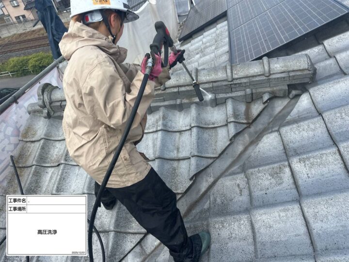 高圧洗浄でしっかりチョーキング、コケ、汚れを落としていきます。