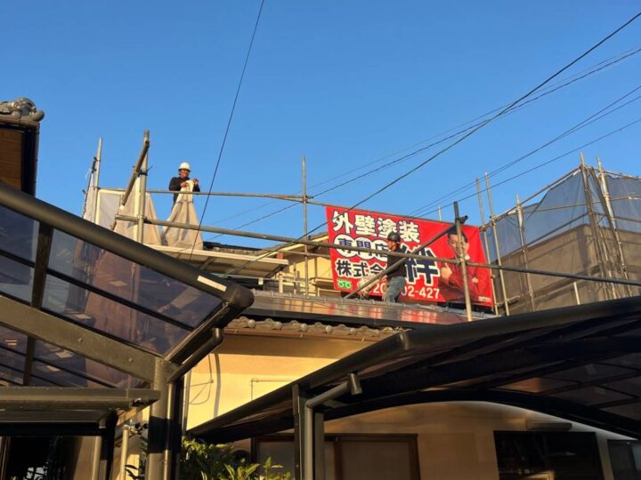 周り4面に足場を組み立てています。安全性を重視して塗装の職人さんが作業をしやすい足場を組み立てます。