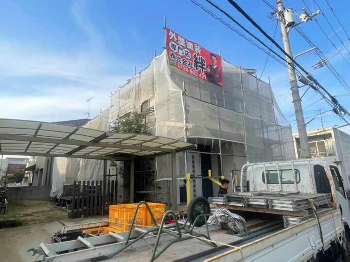 周り4面に足場を組み立てています。安全性を重視して塗装の職人さんが作業をしやすい足場を組み立てます。