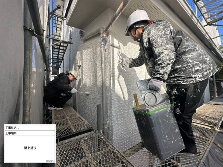 外壁の上塗りの様子です。仕上げ塗りで膜厚をつけて防水性を高めて色のムラが出ないように仕上げています。下塗り同様メーカーが定める希釈率・缶数管理は厳守で行っております。