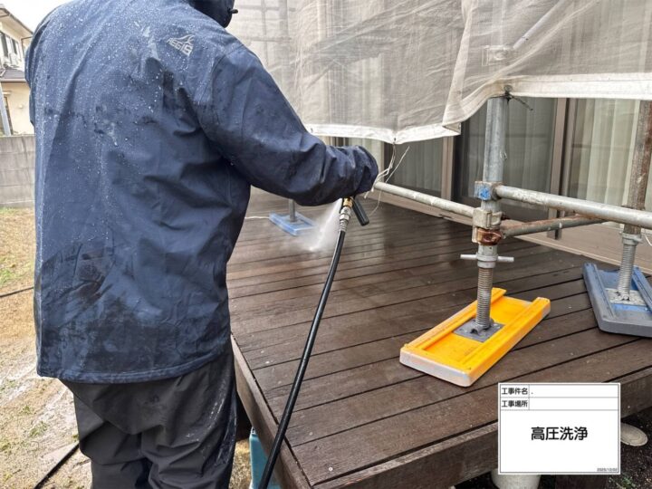 高圧洗浄でしっかりチョーキング、コケ、汚れを落としていきます。