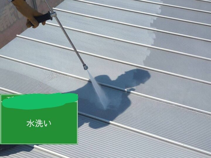 高圧洗浄でしっかりチョーキング、コケ、汚れを落としていきます。